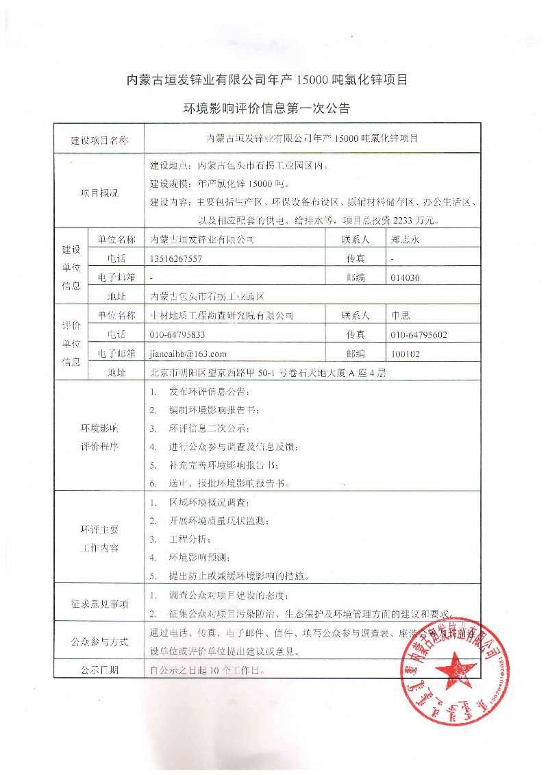内蒙古垣发锌业有限公司年产15000吨氯化锌项目环境影响评价信息第一次公告